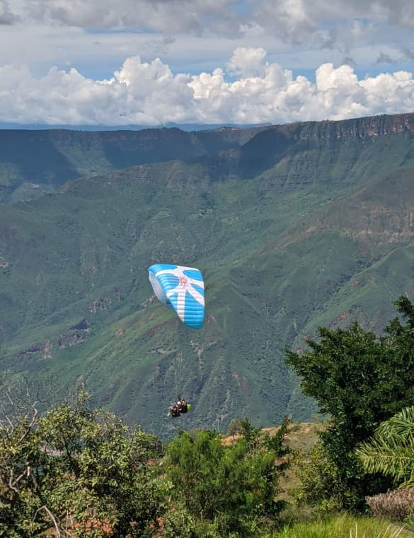 Lugar donde usted podrá volar sobre el cañón y puede aterrizar en el mismo sitio siempre y cuando las condiciones atmosféricas lo permitan si no descenderá en compañía de su instructor en una playa del río Chicamocha. Tiempo de vuelo aproximado de 30 minutos.